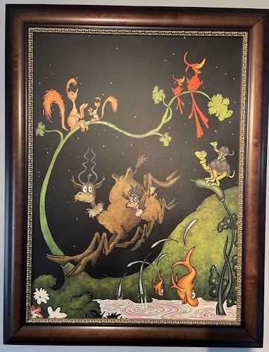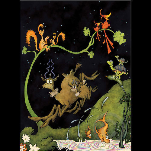 In 1927, Dr. Seuss landed a New York City job with Judge magazine, a weekly satire coveted for its full-color political cartoons. Ted’s unique artistic vision captured the attention of several leading magazines as he went on to create five front covers for Judge alone. The magical middle ground between Ted’s first professionally published cartoon in 1927 and the publication of his first children’s book in 1937 occurs on the June 1933 cover of Judge. Here you not only witness a illustrator hitting his artistic stride on the way to becoming America’s most successful children’s book author, but you also get a preview of his beloved repertoire of bestiary to come.