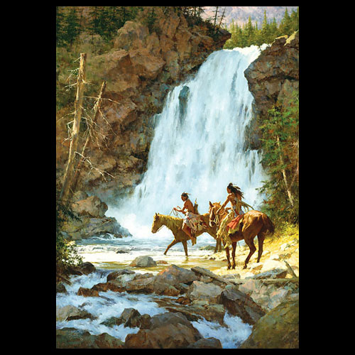 The inspiration for this setting, Running Eagle Falls is located in East Glacier, Montana. Two Blackfoot men navigate a shallow crossing as the late sun spreads across the mid-ground in this painting. Bits of light hit the trees leaning from the left and right edges and a critical touch of sun hits the top of the falls.