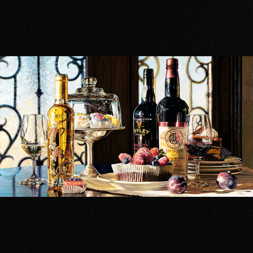 We’ve all heard about “the Sweet Life” – and now we know what it looks like! In “La Dolce Vita” you find yourself seated at a bistro table in front of a fanciful, wrought iron window with shimmering leaded glass. The scrolls of the ironwork are echoed in the Art Nouveau design on the label of the dessert wine. The bottles of port wine stand guard, awaiting their turn. If you were to open the window, only your imagination can envision the backdrop that will unfold behind the sweet treasures that await your palate: fresh berries under a blanket of powdered sugar, pastel petit fours elegantly presented under glass, and a delightful dollop of freshly whipped cream perched atop a generous slice of decadent deep dark chocolate cake. Is there anything sweeter than “La Dolce Vita”?