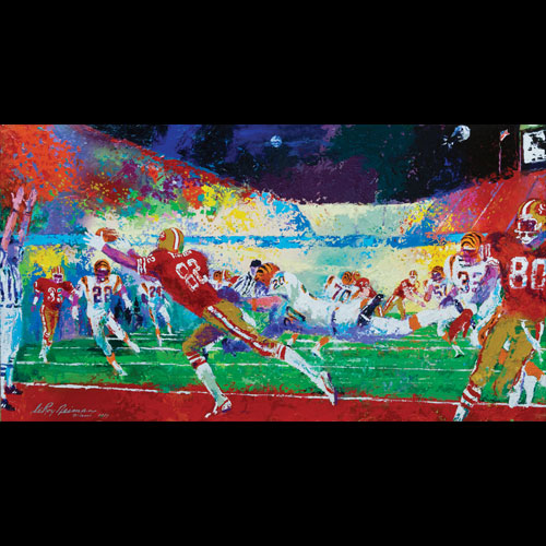 LeRoy Neiman was born in St. Paul, Minnesota and studied at the Art Institute of Chicago, De Paul University, and the University of Illinois.He taught at the Art Institute of Chicago’s school for ten years. Neiman moved to New York City in 1963 when he had his first one-man show at the Hammer Gallery. He then continued to portray the people and events of the world he knew best, or which intrigued him most. His best-known works are sports scenes, a reflection, he believes, of the fact that sports are universally a dominant force. He was the official artist for ABC-TV at the Olympic Games in 1972 and 1976, and at the Winter Olympics of 1980. Neiman’s work has been exhibited in galleries and museums throughout the world, including the Smithsonian Institution in Washington, D.C. and the Hermitage in Leningrad. Some people will pronouce his name wrong and spell it Nieman, but we know who they are talking about.
